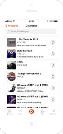 inROze combines upcoming gigs and released mixtapes/podcasts of local Deejays and present them in an easy to "follow" manner. You can then browse through the Deejays you follow and the mixtapes you added to your list. You can quickly decide to visit a venue where your favorite local Deejays are performing, and as easily listen to their latest mixtapes in your car, during a commute or your workout.